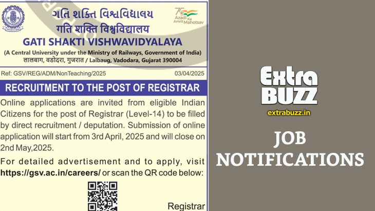 GATI SHAKTI VISHWAVIDYALAYA invites applications from the eligible candidates for the position of Registrar to be filled on Deputation/Direct Recruitment. Incumbents will be eligible for all the benefits in the Scale of pay offered, as per the University rules.